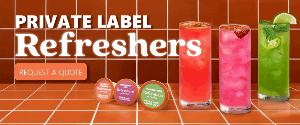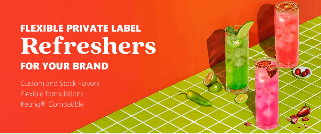 - No allergens, dairy, or animal products. These private label refreshers are vegan, dairy-free, and free from the top nine allergens, as declared by the FDA, making these beverages accessible to customers with specific dietary needs.